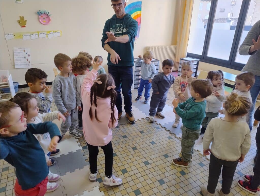 La sĂ©ance sâest poursuivie avec des jeux dansĂ©s : imiter des animaux en mouvement, puis danser Ă deux. Les enfants ont pu exprimer leur imagination tout en apprenant Ă bouger avec les autres.