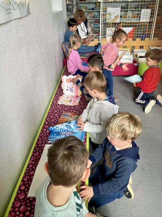 Ce mardi 14 avril, les Ă©lĂšves de PS ont dĂ©couvert la mĂ©diathĂšque et son espace livres. Ils ont pu feuilleter des albums et profiter dâun moment calme autour de la lecture.